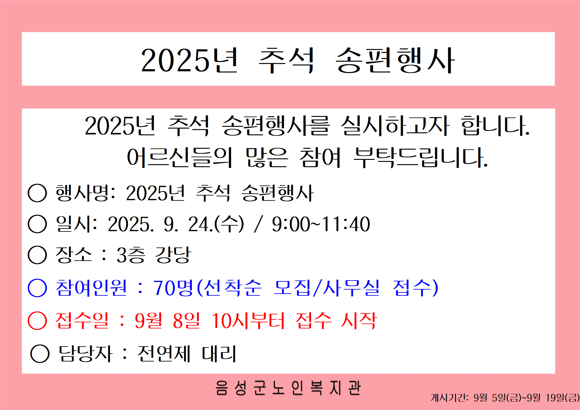 우리가 꿈꾸는 음성은 선배시민이 행복한 음성입니다 음성군노인복지관 커뮤니티 공지사항 홈 > 커뮤니티 > 공지사항 공지사항 보도자료 사진게시판 동영상게시판 자유게시판 고시·채용공고 Menu 공지사항 보도자료 사진게시판 동영상게시판 자유게시판 고시·채용공고 2025년 추석 송편행사 작성자 음성군노인복지관 작성일 2025-09-11 09:58 조회 882 좋아요 0 싫어요 0 인쇄 « 2025년 하반기 이용자 자치회의 안내 음성군노인복지관 근로자대표 선출 결과 공고 » 목록보기