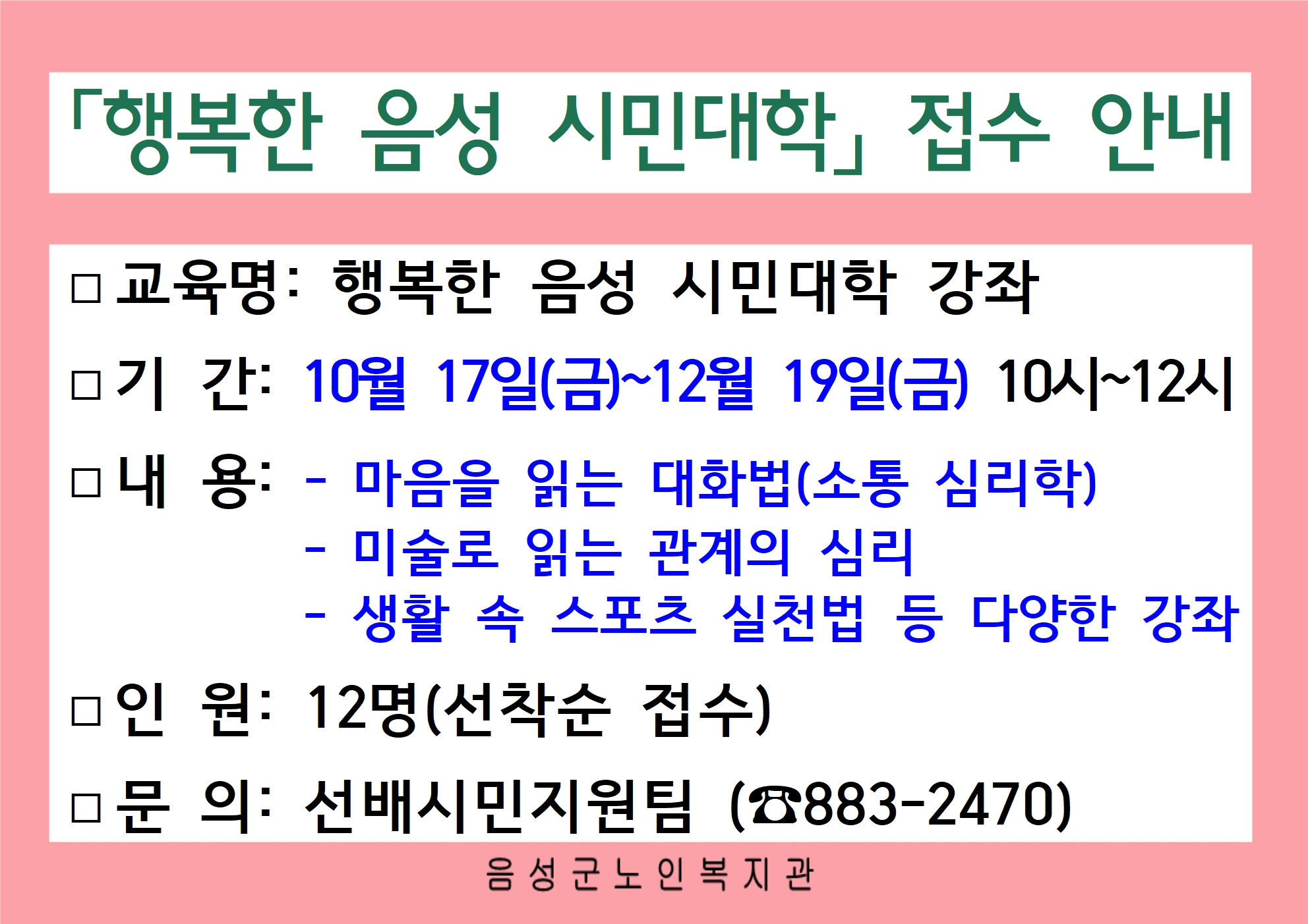 우리가 꿈꾸는 음성은 선배시민이 행복한 음성입니다 음성군노인복지관 커뮤니티 공지사항 홈 > 커뮤니티 > 공지사항 공지사항 보도자료 사진게시판 동영상게시판 자유게시판 고시·채용공고 Menu 공지사항 보도자료 사진게시판 동영상게시판 자유게시판 고시·채용공고 행복한 음성 시민대학 강좌 신청 안내 작성자 음성군노인복지관 작성일 2025-09-29 10:39 조회 723 좋아요 0 싫어요 0 인쇄 « 2025년 9월 사전연명의료의향서 상담 운영 안내 복지관 휴관 안내(추석 연휴) » 목록보기