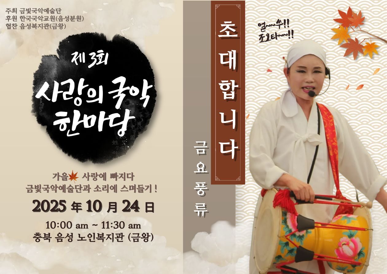 우리가 꿈꾸는 음성은 선배시민이 행복한 음성입니다 음성군노인복지관 커뮤니티 공지사항 홈 > 커뮤니티 > 공지사항 공지사항 보도자료 사진게시판 동영상게시판 자유게시판 고시·채용공고 Menu 공지사항 보도자료 사진게시판 동영상게시판 자유게시판 고시·채용공고 <사랑의 국악 한마당> 국악 공연 관람 안내 작성자 음성군노인복지관 작성일 2025-10-20 15:39 조회 122 음성군의 어르신들께 즐거운 공연을 보여드리고자 금빛국악예술단에서 준비한 우리 소리로 가득한 국악 공연이 펼쳐집니다. 금빛국악예술단의 후원으로 신명나는 공연과 함께 무료 식사도 제공되오니 많은 관심 바랍니다. 10월 24일 금요일 복지관 3층에서 만나요~ 좋아요 0 싫어요 0 인쇄 « 2025년 10월 경로식당 식단표 2025년 11월 경로식당 식단표 » 목록보기