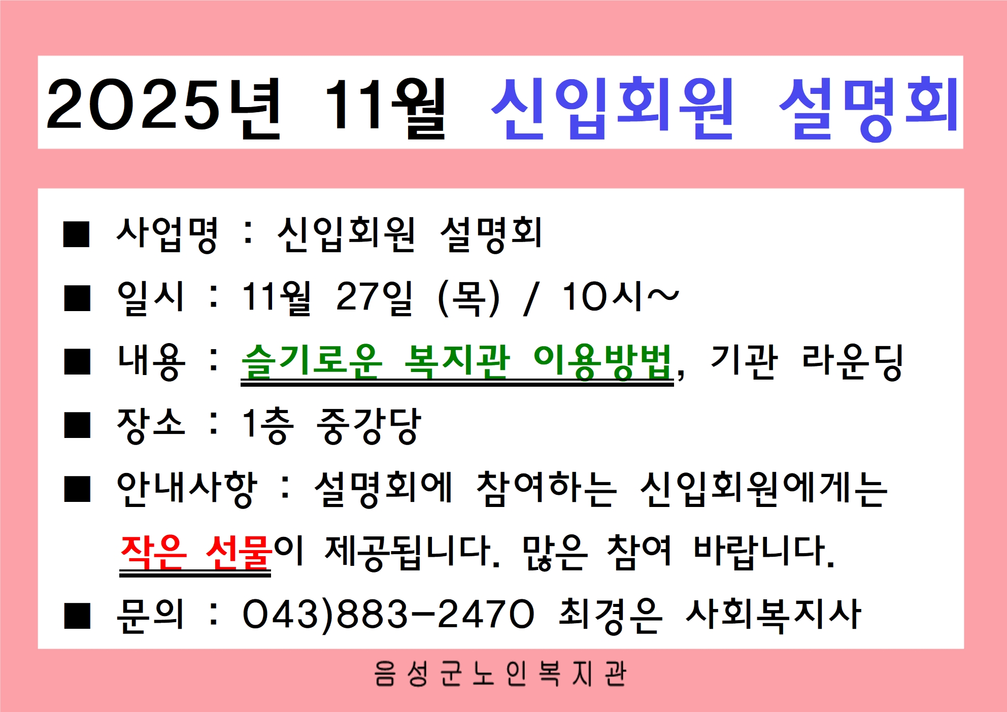 우리가 꿈꾸는 음성은 선배시민이 행복한 음성입니다 음성군노인복지관 커뮤니티 공지사항 홈 > 커뮤니티 > 공지사항 공지사항 보도자료 사진게시판 동영상게시판 자유게시판 고시·채용공고 Menu 공지사항 보도자료 사진게시판 동영상게시판 자유게시판 고시·채용공고 2025년 11월 신입회원 설명회 실시 안내 작성자 음성군노인복지관 작성일 2025-11-26 13:49 조회 51 좋아요 0 싫어요 0 인쇄 « 2025년 11월 사전연명의료의향서 상담 운영 안내 이용자 고충처리 결과 안내(장애인주차장 1면 추가 설치) » 목록보기