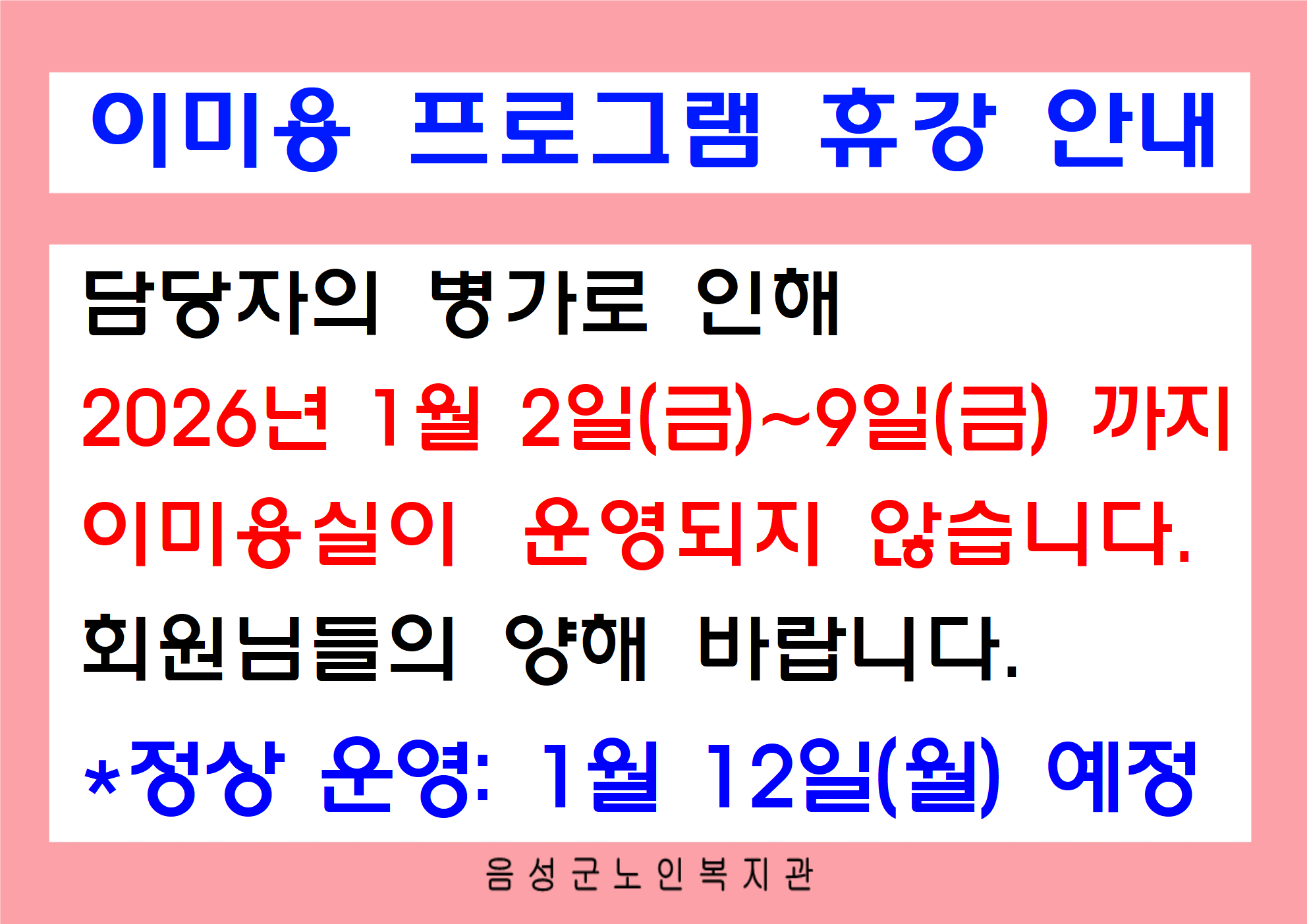 우리가 꿈꾸는 음성은 선배시민이 행복한 음성입니다 음성군노인복지관 커뮤니티 공지사항 홈 > 커뮤니티 > 공지사항 공지사항 보도자료 사진게시판 동영상게시판 자유게시판 고시·채용공고 Menu 공지사항 보도자료 사진게시판 동영상게시판 자유게시판 고시·채용공고 이미용실 프로그램 휴강 안내(1월2일~1월9일) 작성자 음성군노인복지관 작성일 2026-01-02 13:19 조회 69 좋아요 0 싫어요 0 인쇄 « 2026년 노년사회화교육 상반기 프로그램 접수 일정 안내 2026년 1월 경로식당 식단표 » 목록보기