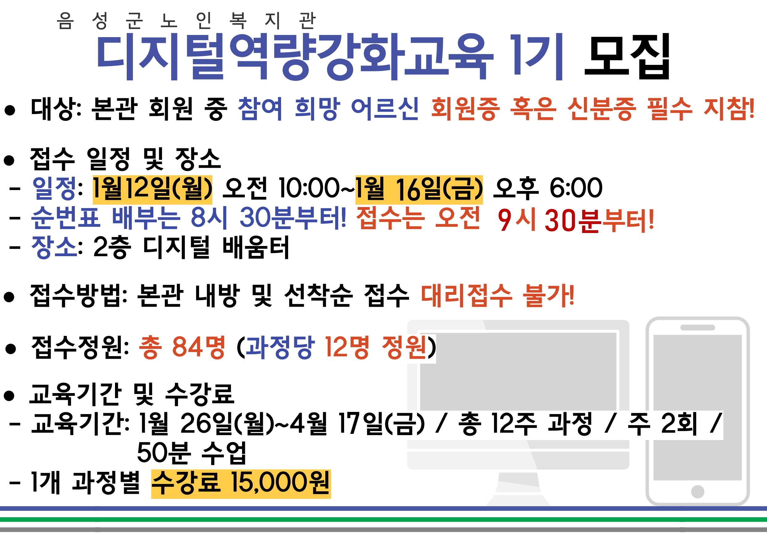 음성군노인복지관은 발전하는 사회의 발걸음에 맞추어 만 60세 이상 회원들에게 스마트폰, 컴퓨터 활용방법 등의 '디지털 역량 강화 교육'을 제공하고 있습니다.