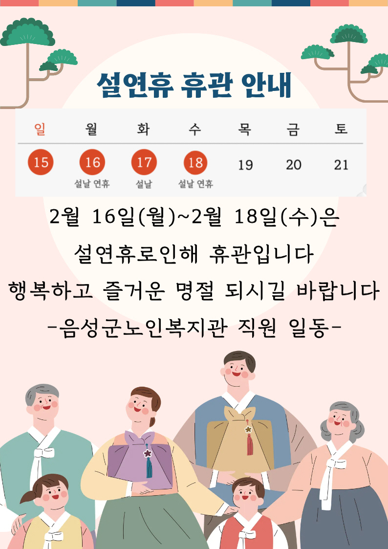 우리가 꿈꾸는 음성은 선배시민이 행복한 음성입니다 음성군노인복지관 커뮤니티 공지사항 홈 > 커뮤니티 > 공지사항 공지사항 보도자료 사진게시판 동영상게시판 자유게시판 고시·채용공고 Menu 공지사항 보도자료 사진게시판 동영상게시판 자유게시판 고시·채용공고 2026년 설연휴 휴관 공지 작성자 음성군노인복지관 작성일 2026-02-13 11:34 조회 71 좋아요 0 싫어요 0 인쇄 « 이미용실 휴강안내(2월 19일 목요일) 2026년 이용자 필수교육 실시 안내 » 목록보기