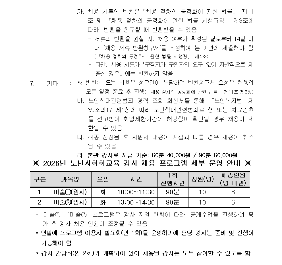 2026년 음성군노인복지관 노년사회화교육사업 미술 프로그램 강사 채용 재공고