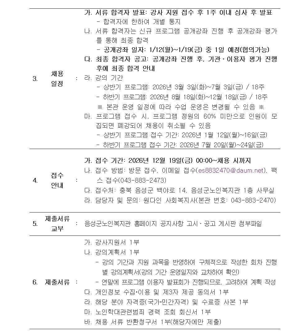 2026년 음성군노인복지관 노년사회화교육 프로그램 강사 최종합격자 발표