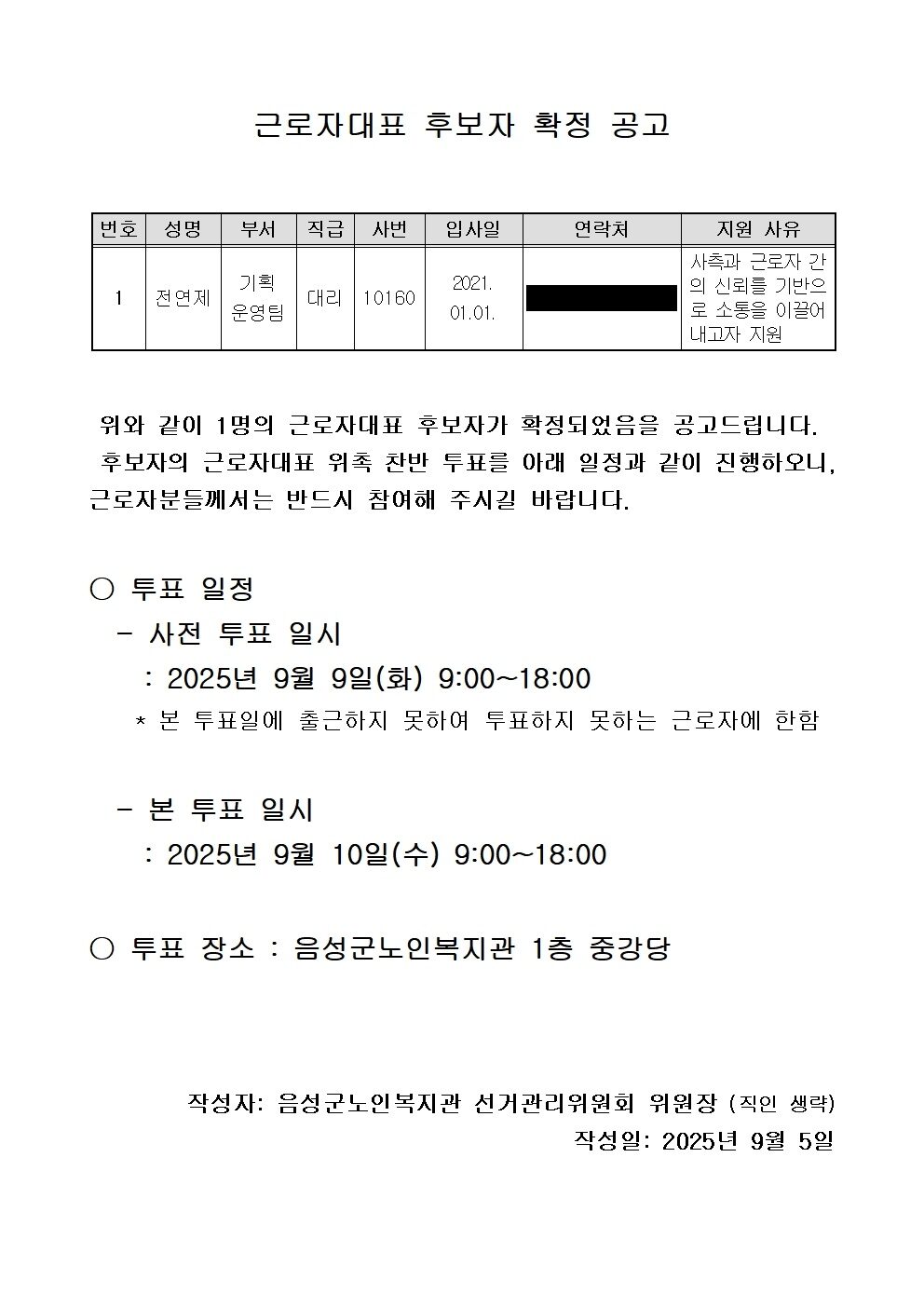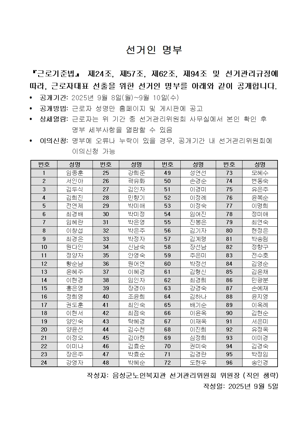 우리가 꿈꾸는 음성은 선배시민이 행복한 음성입니다 음성군노인복지관 커뮤니티 공지사항 홈 > 커뮤니티 > 공지사항 공지사항 보도자료 사진게시판 동영상게시판 자유게시판 고시·채용공고 Menu 공지사항 보도자료 사진게시판 동영상게시판 자유게시판 고시·채용공고 근로자대표 후보자 확정 및 선거명부 공고 작성자 음성군노인복지관 작성일 2025-09-08 14:30 조회 250 좋아요 0 싫어요 0 인쇄 « 근로자대표 선출 공고 2025년 노인학대예방교육 실시 안내 » 목록보기
